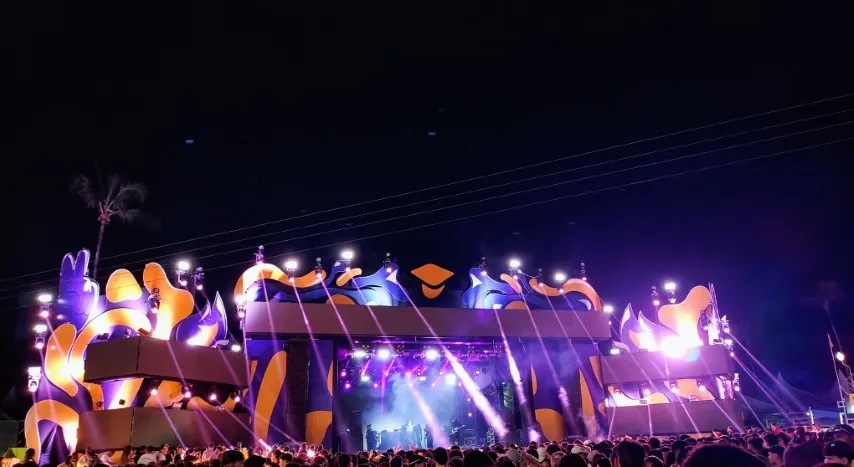 O palco é super tecnológico com telões que exibem um interessante videografismo que não deixa a desejar a nenhum grande festival de música. Há também, canhões de fogo, fumaça e papel picado. Isso tudo cria um visual realmente especial.