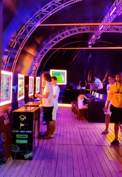 Nas laterais os arcades rodam mais de 10 mil jogos, em sua maioria retrôs que lembram os antigos fliperamas, tais como Neogeo e Capcom entre outros. Há ainda duas arenas rodando FIFA no PS5.