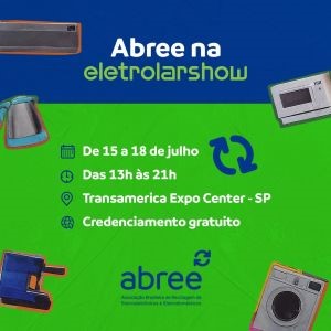 A ABREE – Associação Brasileira de Reciclagem de Eletroeletrônicos e Eletrodomésticos – participa da 17ª edição da Eletrolar Show, maior feira de bens de consumo da América Latina, que será realizada de 15 a 18 de julho, no Transamerica Expo Center, em São Paulo. Durante os quatro dias de evento, a equipe da entidade gestora estará presente no estande F56, localizado na Avenida F.