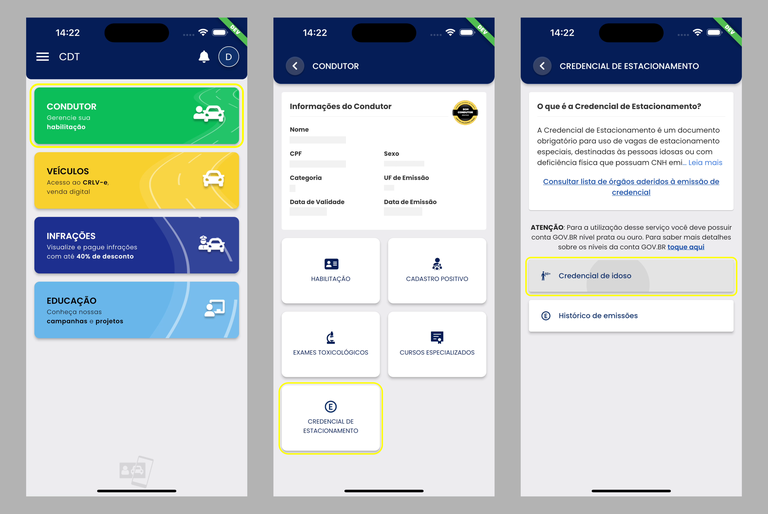 A novidade já está disponível na CDT no item “Condutor”, na tela inicial. Dentro desta sessão, vai aparecer a opção “Credencial de Estacionamento”. Em seguida, vai aparecer uma tela explicando o que é a credencial e o botão para emiti-la. Neste momento, há o lembrete de que é preciso ter a conta Prata ou Ouro no Gov.Br.
