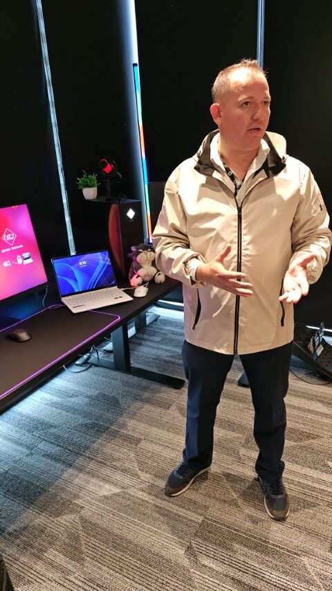 Assim que entramos no espaço há uma sensação de colocar um pé no futuro. As soluções da HP estão ali distribuídas por segmento. Num lugar dá para ver os novos notebooks com IA, em outro cantinho as soluções de games da linha HyperX e HP Omen.