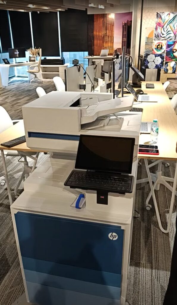 Com uma espécie de notebook acoplado, ele é capaz de scanear dezenas de documentos, identificar cada um deles e encaminhar um e-mail para cada departamento responsável com um breve resumo. Além de imprimir e funcionar como scanner e copiadora, ela acaba sendo um hub central de documentos.
