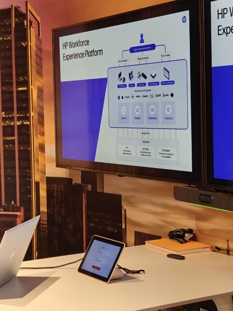 No espaço de Poly conseguimos ver como as soluções da HP estão distribuídas em um portfólio amplo e complexo. Os fones de ouvido são especializados para quem precisa trabalhar em qualquer lugar, num aeroporto ou café e a IA cuida de isolar o som criando uma fenda virtual de isolamento acústico. A webcam consegue sozinha focar em quem está falando numa sala de reunião com várias pessoas. O som vai junto.