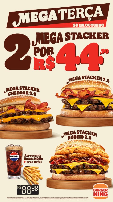 Mais uma vez o Burger King® está trazendo uma promoção imperdível às terças-feiras. Dessa vez, em outubro: a novidade é a Mega Terça! Agora, três sanduíches da linha Mega Stacker estão em destaque: o Mega Stacker.