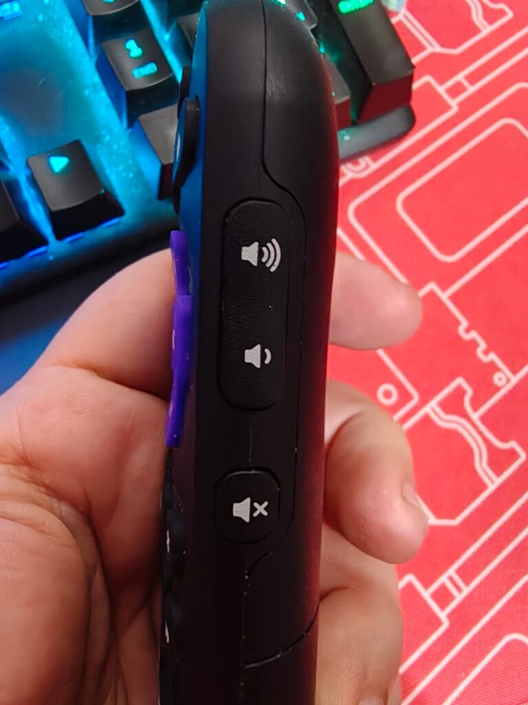 E o novo controle remoto tem muitos ganhos e o principal deles é praticamente deixar desnecessário o uso do controle da TV. Com apenas um controle você resolve tudo. Nos modelos anteriores você precisava usar os dois controles. É um ganho em usabilidade. Controles de volume ficam na lateral.