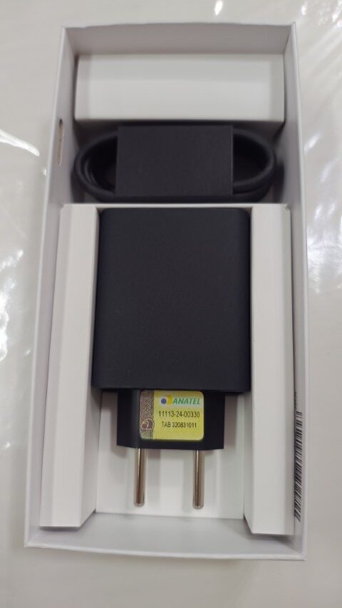 O unboxing dos celulares da motorola é sempre uma experiência que no final vai te premiar com um cheirinho característico da marca. Na caixa temos o celular propriamente dito, um cabo USB C/ USB C e um carregador rápido.
