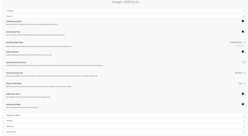 À medida que o trabalho híbrido se torna o novo normal, os departamentos de TI enfrentam novos desafios para equipar e oferecer suporte a seus usuários. Graças ao software Poly Lens, o Voyager 4320 UC Series é fácil de implantar, gerenciar e atualizar remotamente. Alguns dos recursos que as equipes de TI vão adorar: