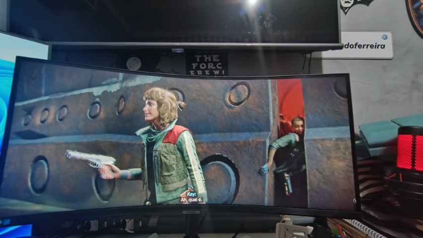 Já para testar em uma dinâmica de gameplay mais movimentada e com muitos elementos em tela eu fui de Star Wars Outlaws e também em Mortal Kombat 1, dois títulos recentes e a experiência de gameplay foi muito fluida. Não há fantasmas na tela ou qualquer sinal de ghosting. Em alguma instância dá até para dizer que minha placa gráfica e os games não deram conta do monitor, tamanha qualidade exibida, mas deu para notar isso só parando mesmo para prestar atenção. Então aqui vale um outro alerta importante: para um monitor dessa qualidade você precisa der um setup que seja a altura da imagem que será exibida, senão você não conseguirá tirar o melhor dele.