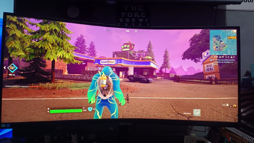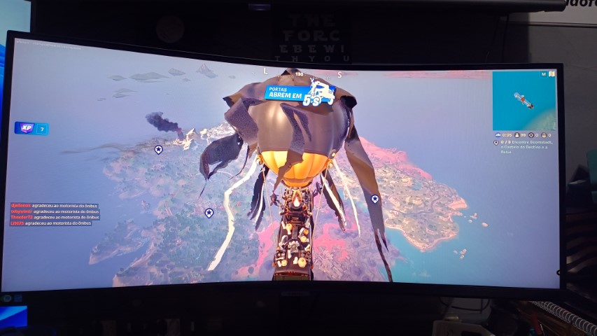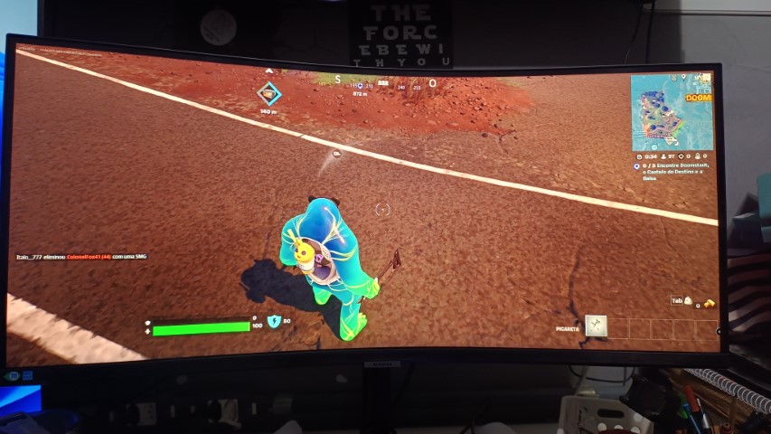 Fazia tempo que eu não jogava Fortnite e lá fui eu voltar para o campo de batalha para testar o monitor. É impressionante o que a gente ganha de campo de visão com esse monitor e a imersão no jogo também ganha outra dimensão. Aos poucos você percebe que para onde você olha tem o mapa do Fortnite e você consegue ter sim uma vantagem competitiva ao conseguir perceber mais inimigos no campo de visão. É uma diferença quase irrelevante para um jogador casual, porém para alguém que leva a jogatina a sério é um baita ganho.