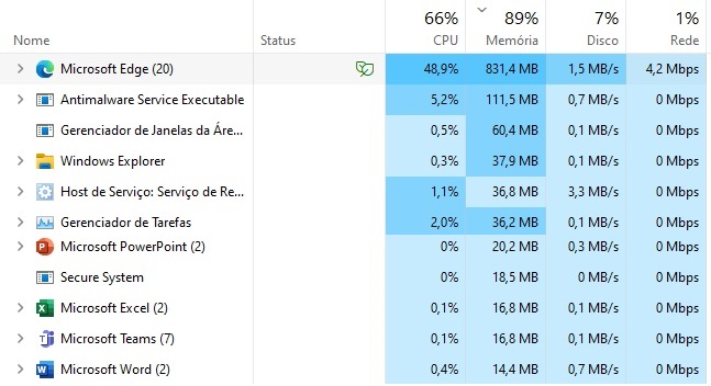 E não caia no erro de instalar o Chrome para acessar internet. Ele consome muito recursos de memória RAM, porém ao usar o navegador Edge – nativo da Microsoft – ele vai bem. Para efeitos de testes eu abri o Edge, mais o Word, mais o Excel e o PowerPoint ao mesmo tempo.