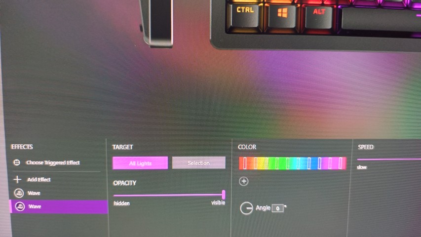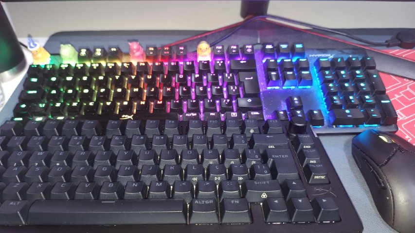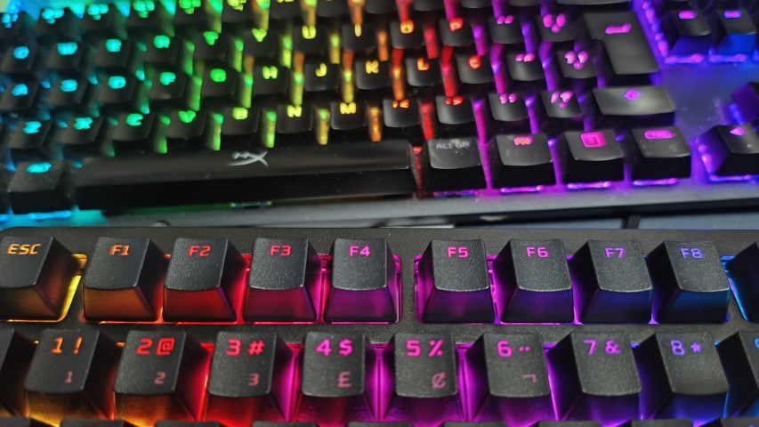 O RGB per-key da HyperX é sempre muito bonito, mas aqui eu achei ele mais discreto, e a impressão que eu tenho é que a pintura preta fosca do teclado absorve muito a luz. Na imagem a seguir veja a comparação com outro teclado HyperX. (é o teclado no inferior da foto).