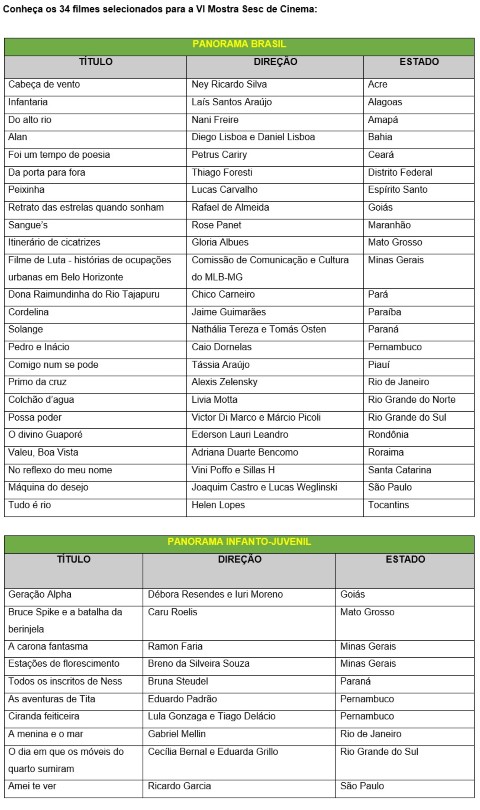 Uma das principais iniciativas de incentivo ao cinema independente no Brasil, a Mostra Sesc de Cinema anunciou os filmes selecionados para a sua 6ª edição. No total, 34 produções (10 longas-metragens, um média e 23 curtas) comporão a mostra nacional, sendo 10 delas referentes ao Panorama Infanto-Juvenil. Os filmes serão licenciados pelo período de um ano e estarão disponíveis ao público a partir de novembro, quando será realizada a cerimônia de lançamento da VI MSDC, no Rio de Janeiro.